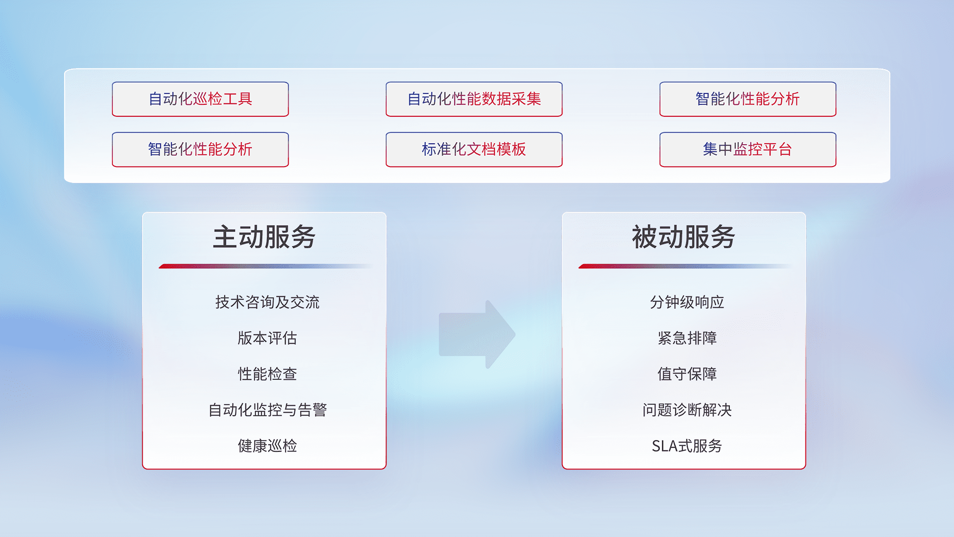 智能化工具和标准化文档,,,,保障服务质量,,,提供主动服务(包含技术咨询、、、版本评估、、性能检查、、自动化监控与告警、、健康巡检)和被动服务包含(分钟级响应、、、、紧急排障、、、、值守保障、、问题诊断解决、、、SLA服务)。。