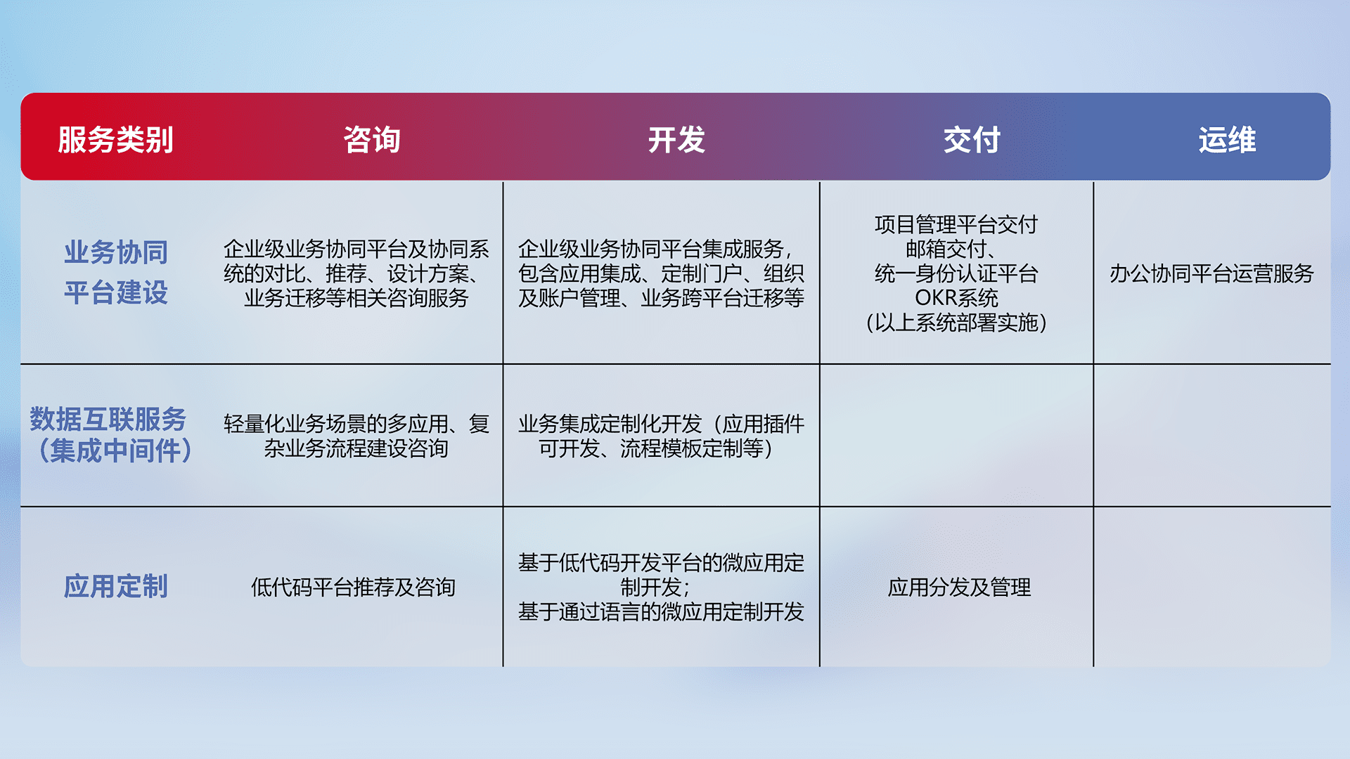 针对钉钉、、、、企微、、IDaas等平台级产品提供产品的规划、、、方案、、、交付、、、定制化开发等服务,,,,实现如统一协同办公、、智能客户服务、、、混合会议管理、、、智能数据查询、、等业务场景,,,,实现数字化转型。。。。
